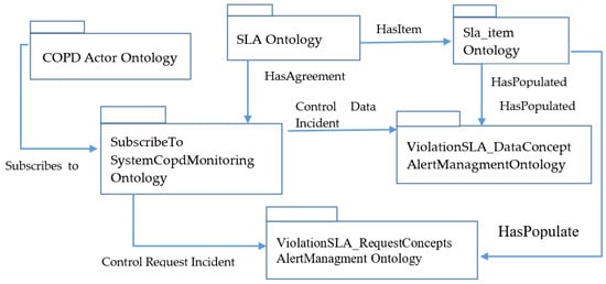 Figure 4 shows the core of the COPDViolationSlaOntology structure. Each component of this structure is an ontology that participates in the implementation of the dynamic evaluation mechanisms of SLA. Each component can be reused to enrich other SLA ontologies. The structure is modular. Each module is described in detail in the following sections. This structure can be linked to the standard COPD ontology, i.e., COPD ontology from the patient COPD Ontology component. COPDViolationSLa Ontology is therefore not an independent ontology. It is a modular ontology that is reusable and extensible with the SLA Ontology Standard.