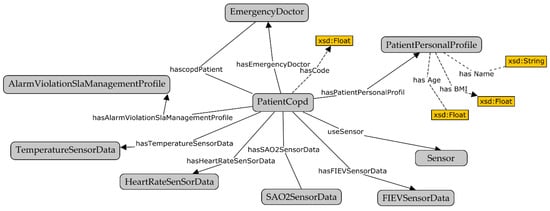 The objective of this ontology in the design of SLA control mechanisms is the dynamic collection of COPD patient data. The data come from the vital signal parameters: Fiev, Heartrate, Sao2, and Temperature. The Object Property and Datatype relationships of this ontology are described in Figure 4. Only the main relationships that participate in the dynamic control mechanisms of the SLA are described in Figure 4.