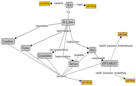 This ontology aims to provide information about the SLA context. For this purpose, it only addresses the description of the different items of the SLA. The items that are mainly involved in the mechanisms of control SLA are KPI-TARGET, Services and SLO. The Object Property and Datatype Property that characterize them are represented in the main table. The hasKPI_Expression_IncidentRequest and hasKPI_Expression_IncidentData relationships identify the incident levels discussed with the various parties signing the SLA. Indeed, the value of the data incident counter is compared with the KPI-TARGET defined in the SLO expression related to the data: KPI_Expression_IncidentData. The same approach is true for the request incident counter value, which is also compared with the SLO expression related to the incident requests: KPI_Expression_IncidentRequest.