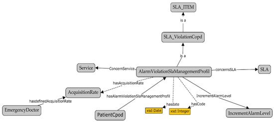 The purpose of this ontology is to record violations information and then populates the information to the template dynamically. The items or concepts that mainly participate in the SLA control mechanisms are patient and violation Sla Data Concepts. The hasAlarmViolationSlaManagementProfile and IncrementAlarmLevel links respectively associate the incident to the patient concerned and increment the incident counter to compare it to the KPI-TARGET extracted from the SLA. The hasAcquisitionRate relationship allows the emergency physician to define data collection periods. This approach makes the SLA control system more flexible. Below, Table 5 describes some properties of violation data concepts and alarm managements.