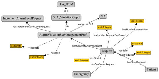 The main branch of the ontology related to SLA control mechanisms is Request, ViolationRequest_Concepts. An incident request occurs if the sent request has not been received by the emergency physician, i.e., the status of the request is not confirmed. The difference between the number of requests sent and the number of confirmed requests in a period determines the number of request incidents. The concept or class allows the recording of these incidents and to populate the virtual template dynamically according to the period.
