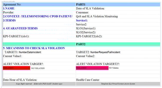 The purpose of a virtual SLA is to dynamically monitor the QoS guarantees of the SLA in a COPD patient monitoring context. This template has two parts. Part 1 represents the offered service that has been validated by the parties. If the data of Part 1 is changed, the virtual template will also be modified in real time. In addition, part 2 presents the dynamic control elements of the SLA. This part adapts dynamically according to the data of the patient context and the context-aware ubiquitous system. Finally, the information described in these two parts is extracted from the ontology presented in the previous sections. To allow a better understanding of the virtual SLA template, important concepts are presented. According to reference [], the SLA template must have important information: SLO, KPI-TARGETs, Condition, and Constraints. Figure 11 describes the virtual SLA template.