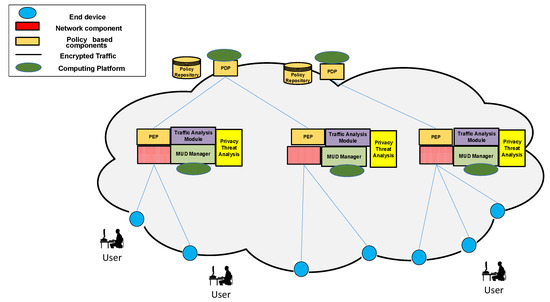 - Network component: It is represented by a switch or router, which is responsible for enforcing the network access restrictions in a MUD file. Such restrictions can be modified according to the identification of privacy threats.
