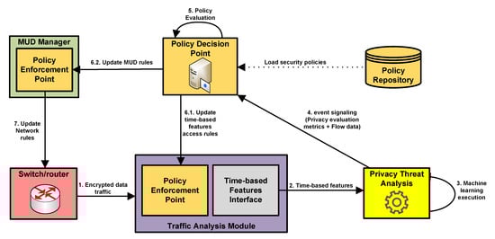 This section describes the proposed solution where the three components described in the previous Section 3 are integrated in a comprehensive framework. Section 4.1 describes the proposed functional architecture where the relationships among the main components are described. Then, Section 4.2 describes the workflow among the different components and the sequence of operations starting from the analysis of the encrypted traffic by the traffic analysis module, which can detect privacy threats on which the policy based frameworks must take action. Section 4.3 describes the machine learning algorithm (i.e., SVM) used to perform the traffic analysis.