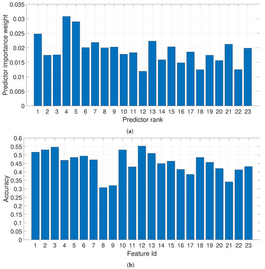 The evaluation of the optimal features used for classification was based on the ReliefF feature selection algorithm. The ReliefF algorithm is a filter algorithm, which finds the weights of predictor features in a multiclass categorical dataset. The algorithm penalizes the features that give different values to neighbors of the same class, and rewards features that give different values to neighbors of different classes. Details on the ReliefF algorithm are provided in [50], but the main concept is that ReliefF first sets all feature weights to 0. Considering a dataset the algorithm iteratively selects a random observation from the dataset, finds the K-nearest observations to for each class, and updates, for each nearest neighbor , all the weights for the predictor features. In this study, the value of K has been set to 1.