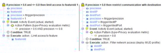 Therefore, we use the SecKit policy language for the specification of preventive enforcement policy templates referencing actual events, where compensation actions include the use of MUD profiles, as described in the following subsection. These policy templates act as mitigation actions for the identified privacy threats.