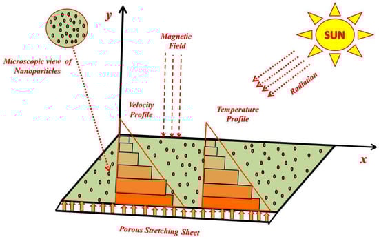 The study of nanofluids over a stretching surface has gained much interest. Sakiadis [] initiated the concept of boundary layer flow over a stretching surface. Hakeem et al. [] pondered over the impact of MHD on the 2nd order partial slip flow of thermally radiating nanofluids over sheets that can either shrink or stretch. In their work, they implemented the analytical hyper-geometric function and numerical shooting techniques and concluded that the skin drag is highest for alumina-water and lowest for silver-water nanofluids in both cases of stretching and shrinking sheets. In addition, their research involves increasing the values of the magnetic parameter that disappear in the lower branch solution of the shrinking sheet. Khalil et al. [] performed a study on dual convection fluid flow and concluded that in a magnetized thermally stratified medium, the fluid velocity is an increasing function of mixed convection parameters but inverse trends are seen towards the magnetic field parameter. In [], Usman et al. modeled Newtonian nanofluid flow manifested with thermal radiation and heat generation in the form of coupled differential equations. They concluded that the temperature depicts the uplift for thermal radiation. The effect of Lorentz forces and viscous dissipation of micropolar nanofluid that passes through a stretching surface using the mathematical model of Buongiorno has been investigated by Hsiao []. With the elevation of Eckert and Prandtl numbers, the increase in thermal profile has been observed. In addition, to enhance the values for these numbers, the rate of heat transfer is also increased. Another study related to the impact of an unsteady MHD flow over a horizontal stretching sheet on its thermal and solutal transfer in the presence of heat generation/absorption was analyzed and enlightened by Mukhopadhyay []. By introducing the uniform stress that was first studied by Crane [], the sheet contains an incompressible flow. Ishak et al. [] considered a KBM solution of MHD fluid flow over a stretched surface. The concept of the slip effect was created by Dorrepaal []. In [], Noghrehabadi et al. reprised the partial slip condition on the heat transfer rate across a stretching sheet of nanofluids. Computational analysis of forced convection of nanofluids in terms of power law was done by Farhan et al. []. Recently, the same authors [] analyzed the heat transfer of the MHD power law for nanofluid flow passing through an annular cavity. Sharma et al. [] evaluated the slip effect of -water nanofluid on the heat transfer rate across a stretching sheet. Though its effects of viscous dissipation are often minimal, their impacts are more important when the viscosity of the fluid is very high. Notable contributions regarding thermal and solutal diffusion nanofluids in different physical situations are presented by [,,,,,,,,,].