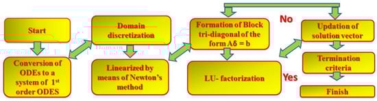 The nonlinear system of ordinary differential Equations (18) and (19), arising from mathematical modeling of the physical system of nanofluid flow are difficult to solve analytically. Hence, the Keller box method [] scheme is implemented to obtain the numerical approximate solutions. The numerical scheme is inherently stable and is second order convergent and also known as the implicit finite difference method. The Keller box method is defined in the form of flow map as depicted in Figure 3.