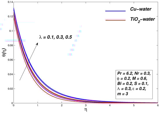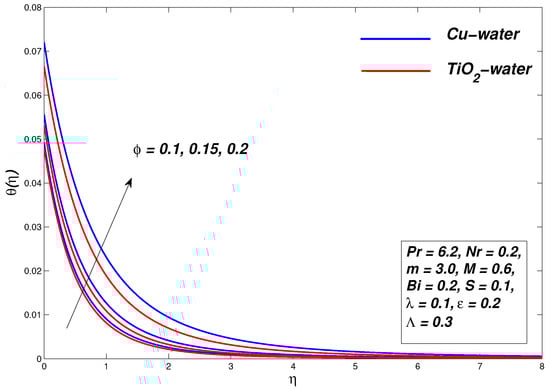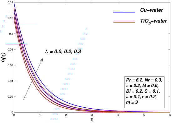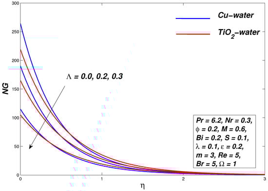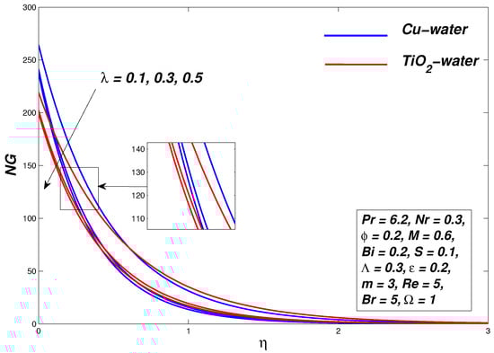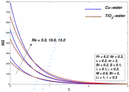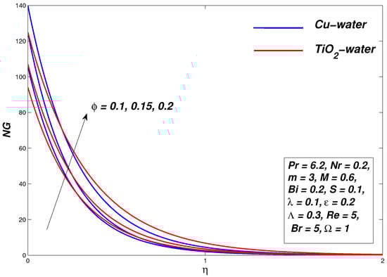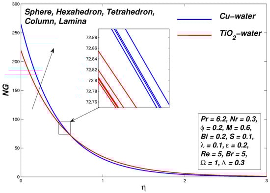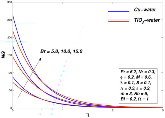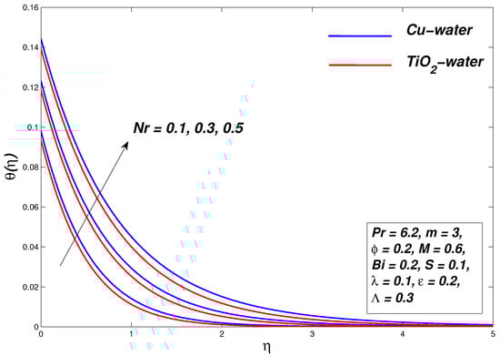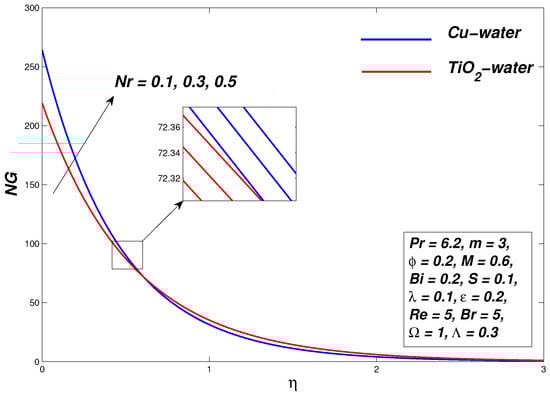 Figure 16 ponders upon the thermal radiation parameter impact on temperature distribution profile of Williamson nanofluids, showing that the temperature of nanofluid decreases for ascending values of . The thickness of the thermal boundary layer reduces with fall in temperature. Figure 17 displays the affect imposed by on the entropy profile for water based nanofluids. There is no change in the velocity profile but the entropy of nanofluids slows down by variating Nr. The results are steady for all the distances into the boundary layer, which validates the benefits of using the thermal radiation in nano scale material exemption processes. Successively, thermal emission enhances the thermal diffusivity of the nanofluid for the rise of the radiation parameter, heat will be added up to the routine and temperature will be increasing. Furthermore, it is evident from Table 4 that at the surface, heat exchange rate rises for both -water and -water; on the other hand, the velocity gradient remains constant.