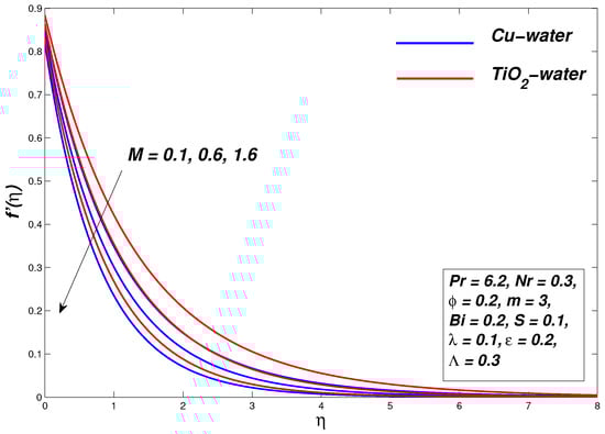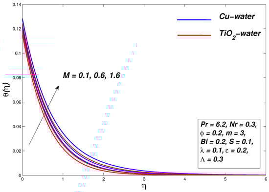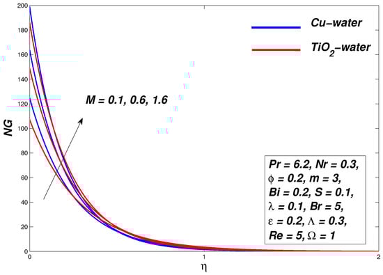 Figure 7, Figure 8 and Figure 9 illustrate the graphical representation of the influence of the external magnetic field on the flow of the nanofluid as well as on the distribution of its temperature in the boundary layer and the generation of entropy. The declining behavior of the velocity profile strengthens with a strong magnetic M; hence, the thickness of the momentum boundary layer decreases. The physical explanation behind the regression of the boundary layer thickness is that the Lorentz force appears when a normally applied magnetic field interacts with an electrically conducting nanofluid. As the strength of the applied magnetic field increases, the strength of Lorentz force also increases and acts opposite to the fluid motion and thus the resulting resistance in fluid reduces the thickness of the momentum boundary layer. In Figure 8, the temperature of nanofluids rises with an upsurge in the strength of parameter M and thus increases the thickening of the thermal boundary layer. It is also found that the parameter M is inversely proportional to the density of the nanofluid, and therefore the increase in M reduces the density as a result of the increase in the temperature of the fluid. The increase in nanofluid temperature within the boundary layer decreases the heat transfer rate at the boundary, but the drag coefficient increases by variation of M. The entropy of the system increases by increasing magnetic parameter strength.