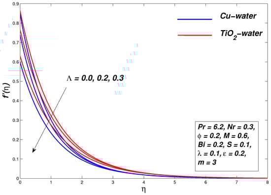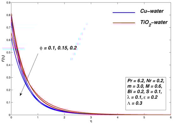 The following discussion is based on the numerically obtained results by the framework detailed in the previous sections. The effect on the velocity and temperature profiles of the physical parameter and the entropy generation on the Williamson nanofluid is conscious. For and water-based nanofluids, the numerical calculations are performed. In Table 4, a few of the values of the drag and heat transfer rate at the surface corresponding to flow governing parameters are collated in a table. These results have been recorded for , , , , , , and . In the subsequent graphs, the behavior of -water nanofluid is embodied in blue color and the behavior of -water is shown by red color.