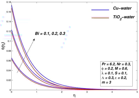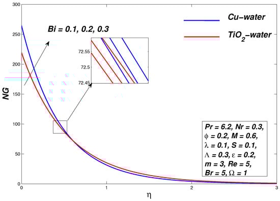 Figure 18 and Figure 19 display the plots of the nanofluid temperature and entropy generation, respectively. Figure 18 depicted the temperature of the nanofluids, which rises due to a greater Biot number. The lower value of the Biot number indicates a stronger conduction within the surface and the high Biot number concludes an extreme conduction at the surface level. The temperature continues to expand due to increased thermal energy in nanofluids. An increase in causes the greater heat transfer from the boundary to the fluid, which occurs to increase the conduction of the boundary layer. However, there are marginal effects of the Biot number on the velocity profile of the nanofluid. In this case, entropy increases due to the heat transfer. The internal thermal resistance to the sheet surface is very high and there is no convective heat transfer from the sheet surface to the cold fluid well away from the sheet.