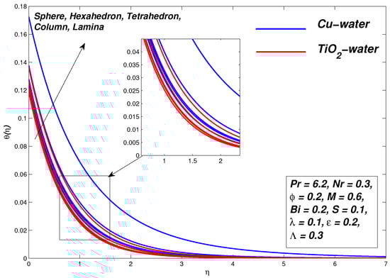 Figure 20 describes the impact of different nanoparticles shapes on the heat transfer abilities of the nanofluid within the boundary layer flow of – and – nanofluids, at a fixed volume fraction . From the graph, it is shown that the non-dimensional temperature of the nanofluid rises as the values of m increases. Temperature is found lowest for spherical shape nanoparticles, followed by hexahedron, tetrahedron, column and lamina. Whereas the spherical shaped particle due to their enhanced surface area tends to draw more heat from the boundary layer while this effect is less obvious for the rest of the shapes. This accounts for the highest rate of heat transfer at the boundary for the spherical shaped nanoparticles, as can be seen in Table 4. Figure 21 shows that the smooth texture of spherical shaped nanoparticles helps minimizing the entropy of the system, as expected.