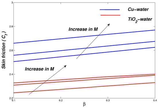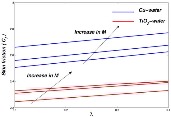 The effect of magnetic parameter M and radiation parameter on the physical quantities of skin friction coefficient and Nusselt number profiles of -water and -water nanofluids are shown in Figure 24 and Figure 25, respectively. In Figure 24, computations are performed for whereas the parameter takes the values . It is noted when we increase the magnetic parameter M the skin friction coefficient increases. In Figure 25, computations are performed for whereas the Prandtl number is fixed on . It is seen that with the increase in , the rate of convective heat exchange also increases, which means that the boundary temperature goes up as the radiation parameter increases while the thickness of the boundary layer decreases.