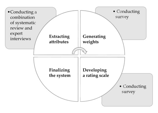 The SCS for AI implementation was developed by using a three-level MAVT adapted from Teo and Ling [36]. This approach consisted of four parts: (1) extracting attributes at different levels; (2) generating weights for the attributes; (3) assigning a rating scale for the attributes; and (4) finalizing the system [36] (see Figure 1). Several techniques were used to accomplish these steps. A combination of a systematic literature review and expert interviews was used for extracting attributes; a questionnaire-based survey was used for generating weights; and a questionnaire-based survey was used for developing a rating scale.