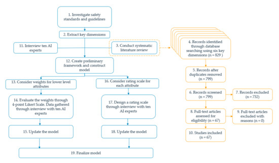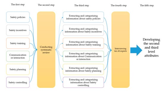 The main reason for using a combination of systematic review and interviews was to identify the main topics of AI safety in the included literature, and to expand these topics through consultation with ten AI domain experts. In addition, we aimed to ensure that all the main aspects (elements) of AI implementation safety were addressed. For this purpose, first, a systematic review was conducted, and the main elements of safety in different key dimensions were extracted. Second, the extracted information was categorized and discussed during interviews with AI domain experts to produce the third attributes, as illustrated in Figure 2.