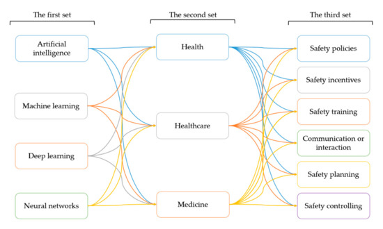 A search strategy was developed by (1) defining keywords and identifying all relevant records, (2) filtering the identified articles, and (3) addressing the risk of bias among records [39]. Three sets of keywords were defined, and their combinations were used to identify relevant articles (Figure 3).