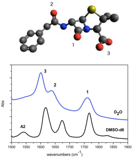 Penicillin G molecule (A) and its IR spectra (B) in (blue line) and in (black line). Assignments are given: (1) stretching; (2) ; (3) asymmetric stretching of carboxylate group. A large red shift of (A2), out of the frequency window, is observed upon proton exchange in .