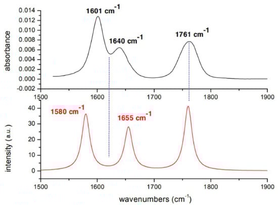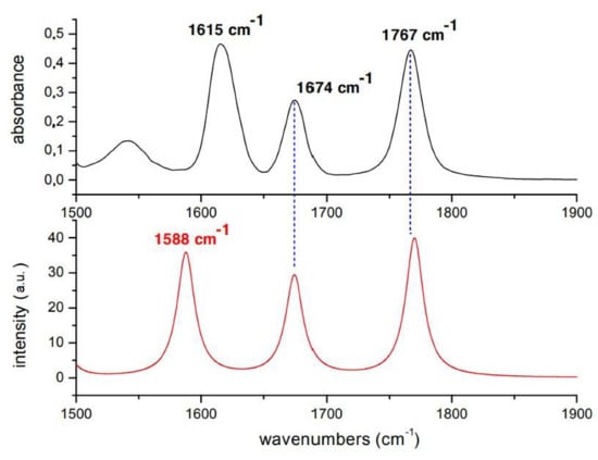 Assignment of Penicillin IR bands is obtained by comparing the experimental FTIR spectrum with previous spectra [] and with the spectrum obtained from ab-initio calculations. The comparisons between experimental and calculated spectra in and are reported, respectively in Figure 2 and Figure 3. Calculated frequencies are corrected by a factor 0.98 providing the exact matching between the experimental and calculated value of vibrational mode. Experimental and calculated frequencies are reported in Table 1.