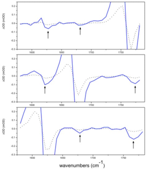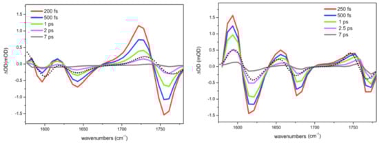 Broad-pump broad-probe spectra are recorded up to 10 ps in parallel and perpendicular polarization. The signal at the magic angle, calculated following Equation (1), gives access to the vibrational lifetime: the excited state absorption (ESA) decay time and the ground state recovery (GSR) (from the bleaching/stimulated emission signals) time constants. In only CO kinetics are reported (Figure 5). The Amide I and the carboxylate CO are largely overlapped among them and superimposed to a weaker signal around 1600 cm, which make unfeasible the estimation of the lifetime due to a strong thermal signal.