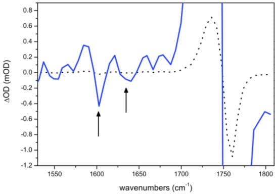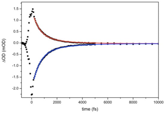 where and are the relative weights of the two exponentials. The averaged lifetime of the signal in water is 0.9 ± 0.1 ps (see Table 2). This is a typical value of CO lifetimes in water [,,,,,] and must ascribed to the fast modulation of hydrogen bond formation and break, allowing a fast efficient relaxation pathway.