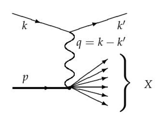 Feynman diagram describing the kinematical set-up, where k and are the momenta of the initial and final electrons, respectively, while p is the momentum of the incoming proton, typically taken in the rest frame. The set of final hadrons, X is not detected and summed over, cf. Equation (3).
