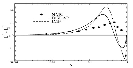 At this point one important aspect has not been considered. As it stands, Equation (29) is the pion structure function at the scale at which the NJL-model is supposed to approximate QCD. Stated otherwise, the structure function computed from Equation (29) approximates the QCD result at a (presumably) low renormalization scale. To allow a comparison with data, the QCD evolution equations must be applied to the model prediction. At that stage, the low renormalization scale enters as a new parameter that is tuned to optimize the agreement with the data at the higher energy scale of the experiments. This calculation has been carried out in Ref. [52]. Here we will not further elaborate on QCD evolution but will get back to it in Section 6 in the context of the nucleon structure functions.
