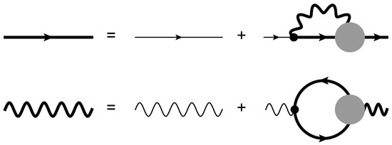 Dyson’s equations in QED relating the dressed fermion propagator, the dressed photon propagator and the dressed vertex function. Thin lines represent bare propagators, while thicker lines represent the dressed ones.
