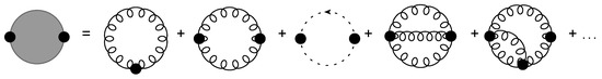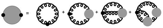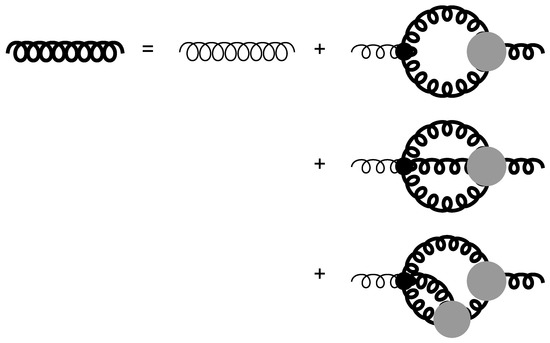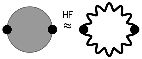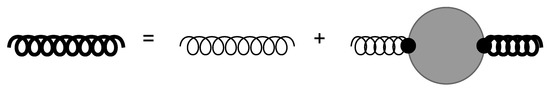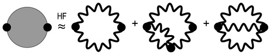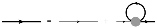 To derive the Hartree–Fock approximation, one can first write down Dyson’s equations for the dressed propagator and the dressed vertices, as shown in Figure 3. The Hartree–Fock approximation to the self-energy is then obtained by replacing the bare propagator with a dressed one in the lowest order loop diagram, as shown in Figure 4. There the dressed scalar propagator is to be determined self-consistently from the solution of the nonlinear Hartree–Fock equations. It should be noted that in the lowest order approximation the loop integrals involve the dressed scalar propagator , while the scalar vertex is still the bare one. This is a characteristic feature of the Hartree–Fock approximation both in many-body theories [38] and in QCD [49,50].