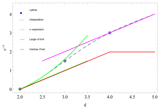 with and some d-dependent coefficients, given below. From Equation (49) one notices that at weak coupling and for a non-vanishing -field expectation value implies that m, the mass of the field, is zero. If one sets , one can then write the first expression in Equation (49) as