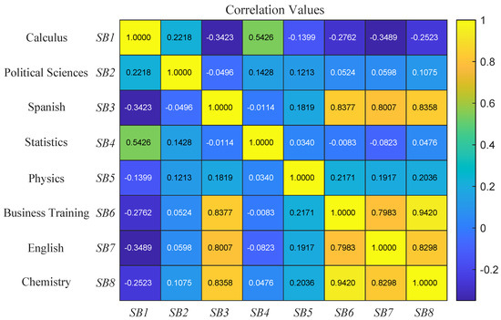 As a summary of the above, Figure 1 allows knowing the related subjects as observed with , , , and ; however, when considering the relationship between previous subjects, it should be borne in mind that although there is a high correlation value, there are subjects that do not belong to the same area of knowledge. In this way, subjects that may be affected by common factors such as previously viewed subjects can be established as shown below.