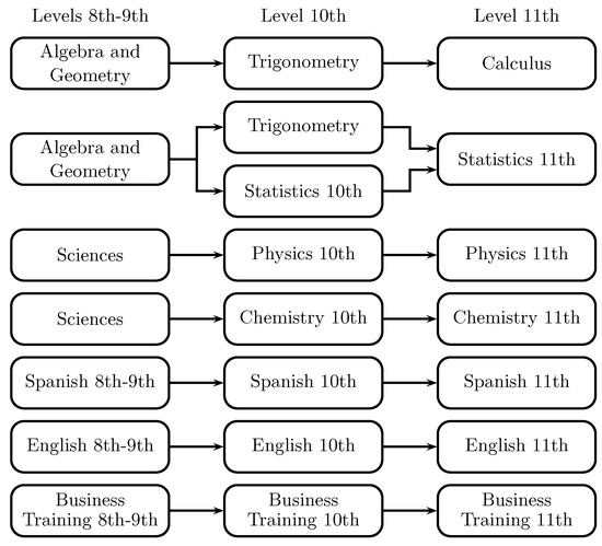 Taking Table 2 and Figure 1 as a reference, it is possible to make the graph of Figure 2, which allows visualizing the learning trajectories for each subject throughout the educational levels proposed, excluding subjects with no high correlation degree or those that, during the teaching process, do not have a relationship between topics. In this way, the relationships among the subjects used to design the prediction system are established.