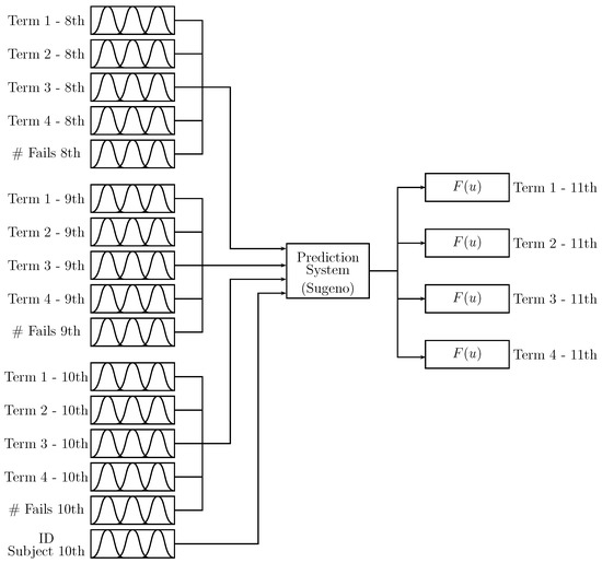 Figure 4 shows the proposed Prediction Model 1 (PM1), which incorporates the inference process into a single zero-order Takagi–Sugeno fuzzy inference system. The system inputs of Figure 4 are the “term” values (student scores) for Periods 1 to 4 of 8th, 9th, and 10th grades. The number of absences “# fails” of the student at the 8th, 9th, and 10th levels is also taken as input; besides, the identifier “ID Subject 10th” is employed (according to Figure 2 and Table 2). The outputs are the predicted term values for Periods 1 to 4 of 11th grade. The “term” scores of the inputs and outputs are values between 0 and 100, the number of absences depending on the number of lectures of the academic period and the subject identifier according to Table 2. In order to reduce the number of inputs, the value of the “final exam” for each level is not included in the prediction system; this can be considered as a system complexity limitation.