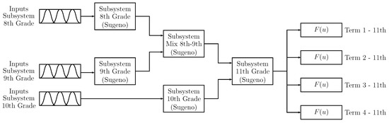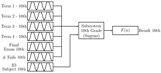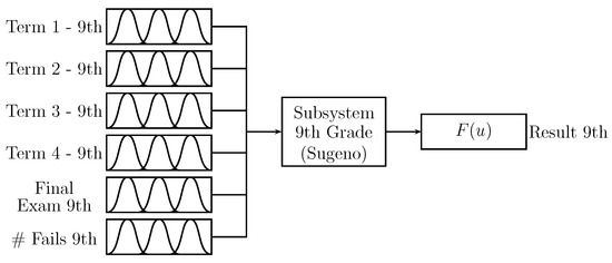 As observed in Figure 5, the creation of a combination subsystem was proposed where the outputs of the subsystems “8th grade”, and “9th grade” are used to obtain a single output. The range of values for the inputs and output of the subsystem “mixed 8th–9th” is . In the same way, the subsystem “11th grade” uses the outputs of subsystems “mixed 8th–9th” and “10th grade” to attain the “term” prediction values of “11th Grade” for each of Period 1 to 4. The range of values for the inputs and output of this subsystem is .
