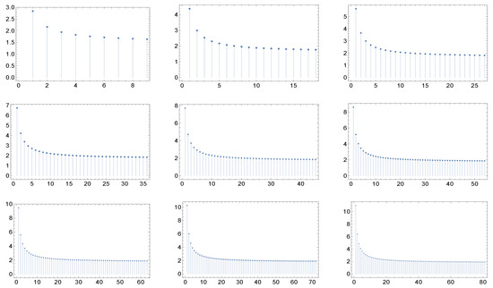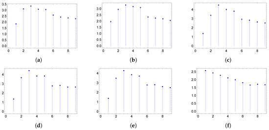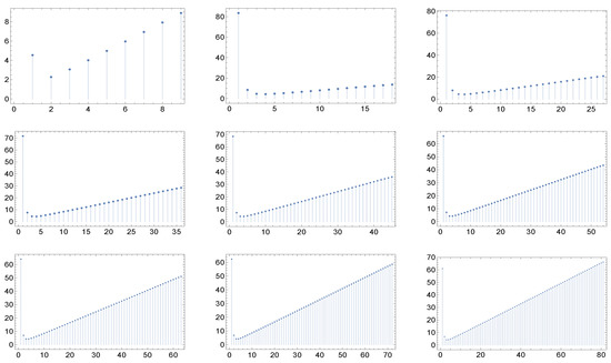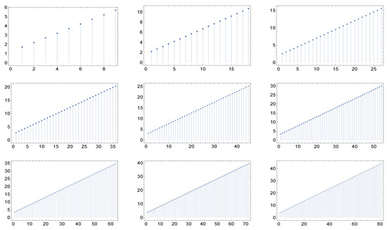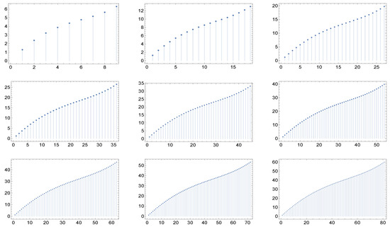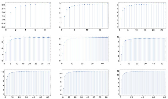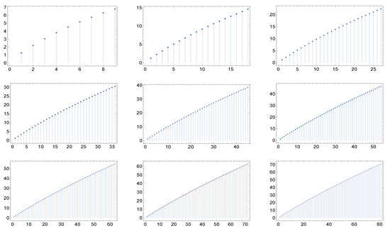 The nine panels display the graph of the function for the cases of maximal degree for networks whose correlation matrices are described in (a recipe for assortative networks from the work in [17] by Vázquez et Al and the work in [18] by Nevokee et Al). Here, and . Moreover, here we have the quasi-invariance (actually, the invariance) of the shape with respect to the maximal degree.