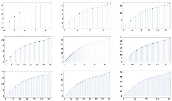 Figure 1, Figure 2, Figure 3, Figure 4, Figure 5 and Figure 6 display for each of the described network cases the graphs of the function in correspondence to nine different values of the maximum degree: 9, 18, 27, 36, 45, 54, 63, 72, and 81. Of course, we have to fix in each case a particular value of the parameters, and these are specified in the captions of the figures.