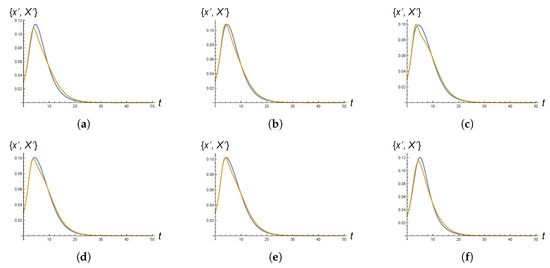 The panels (a–f), respectively, refer to networks related to the points (1)–(6) of Section 3. Each of them displays the evolution in time of the functions and , derivatives of the “cumulative” solutions of the systems (15) and (16), respectively. More precisely, in each panel the blue graph represents the numerical solution of system (15) for networks with correlation matrices as in Section 3 and the yellow graph represents the solution of system (16) on top of a concrete network of the same family. The values of t in correspondence of which the two graphs exhibit a maximum are the peak times.