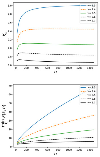 is also introduced, whose properties are then explored (In [6] and [7] a different notation from that one adopted here is used to indicate the average in (17)). Notably, in the assortative case, the ansatz is there considered that for some positive . It is then shown that tends to infinity as . This property does not seem to be satisfied in general, namely, for all assortative families, by the relative . For instance, for the exponential family of Section 3 one can numerically check that the dependence of on n in correspondence to various values of the exponent occurring in the degree distribution is as displayed in the left panel of the Figure 10. At least for certain values of the value of is not increasing and does not look at all as tending to infinity as . However, of course, as well shown in Figure 5, the function for the exponential family does not grow as . It has nonetheless to be emphasized that also for this family the crucial property towards the determination of the absence of epidemic threshold [6,7], namely the growing character of