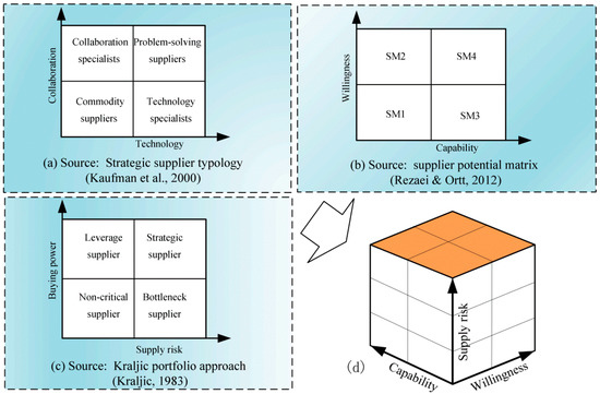 (a) Nomenclature of suppliers; (b) “Capability” and “Willingness” dimensions; (c) Exacted “Supply risk” dimension; (d) Three dimensions of innovative supplier evaluation.
