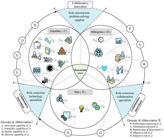 As shown in Figure 2, from the NEV manufacturers’ standpoint, in order to conduct a comprehensive evaluation of the power battery innovative suppliers, only the three bubble intersection of capability (C), willingness (W) and risk (R) is considered reasonable and effective.