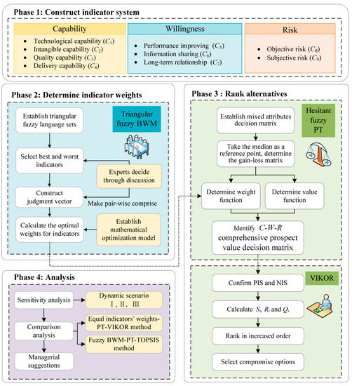 The general framework of a hybrid BWM-PT-VIKOR method integrating fuzzy linguistic judgement is visually described in Figure 3. This method is divided into four phases: in phase 1, DMs construct the indicator system, determine alternative suppliers, and collect data by using the crisp values and hesitant fuzzy (HF) linguistic judgements; in phase 2, DMs determine weights of indicators by using fuzzy best-worst method (BWM); subsequently in phase 3, DMs need to identify a C-W-R comprehensive prospect value decision matrix, and then the VIKOR method is implemented to rank alternatives and select the compromise innovative supplier; finally in phase 4, sensitivity analysis and comparison analysis are implemented, and managerial suggestions are also presented.