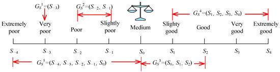 Let S = {|α = −τ, …, −1, 0, 1, …, τ} be a symmetrical linguistic term set [42,43], when 9-scale is adopted symmetrically: = {extremely poor, very poor, poor, slightly poor, medium, slightly good, good, very good, extremely good}, the linguistic variable GSx can be interpreted as a fuzzy restriction label.