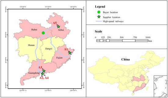 From the view of the objective and subjective information sources, the risk of supply includes objective risk (denoted as C8) and subjective risk (denoted as C9). Objective risk is a distance that can be quantified, so geographical proximity (denoted as C81) is defined as the distance in connection with the means of vehicle (travel time) [28]. Let Ttrain denote the travel time by high-speed railway from the supplier’s city to the buyer’s city, which is defined as