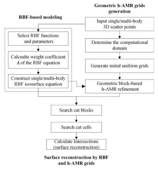 Figure 1 shows the main process of this work. It can be divided into three main steps: (1) initial grid generation and the geometric refinement of the h-AMR grids; (2) single/multi-body RBF geometric modeling through scatter points; and (3) the calculation of the intersecting points based on the combined RBF and h-AMR background grid.