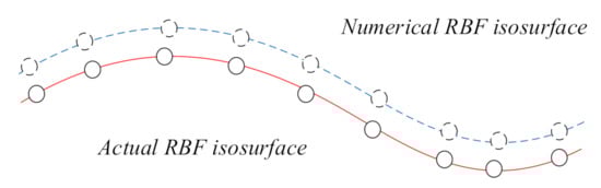 Afterward, Equation (6) can be reconstructed by the coefficient and the sample points. The actual zero-valued RBF isosurface in Equation (5) can be obtained by subtracting the distance d. In our previous 2D work [17], d = 1 is suggested. This work further validates the correctness and robustness of the distance d in the simulation.