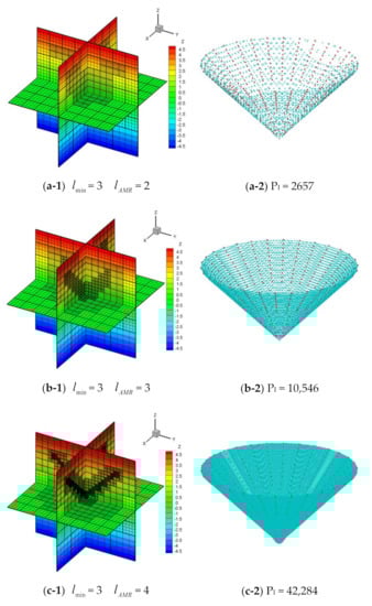 is the center of the ellipsoid. In Case 1, the ellipsoid is located at the center of the computational domain. are the lengths of the principal axes. Table 3 lists the parameters of the ellipsoid and the h-AMR grids.