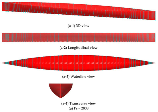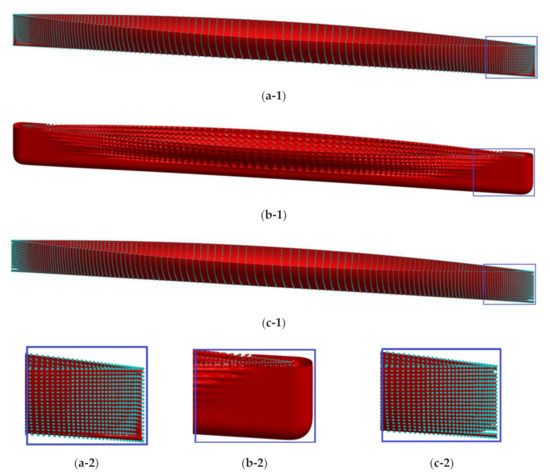 In Figure 17, we can see that both sets of sample points can result in the correct reconstruction of the Wigley hull. However, due to the relatively sparse given points, the surface reconstructed by (a) Ps = 2808 sample points is comparatively not smooth at the midship section. Its waterline profile shows pronounced depression. By using the (b) Ps = 5422 sample points, the distortion of the reconstructed surface can be clearly reduced.