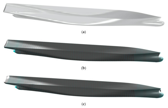 Comparison of KCS hull models (a) Standard explicit model; (b) Implicit model by MQ-RBF of c = 0; (c) Implicit model by C2- CSRBF of = 1.0.