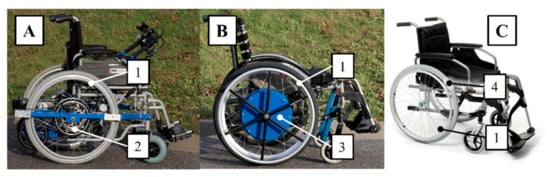 Wheelchairs used during the tests: hybrid manual-electric (A), multispeed with the planetary transmission (B), typical semi-active with the pushrim drive (C); where: 1—pushrims, 2—BLCD (brushless DC motor) electric motor embedded in the hub, 3—planetary transmission embedded in the hub, 4—drive wheel.