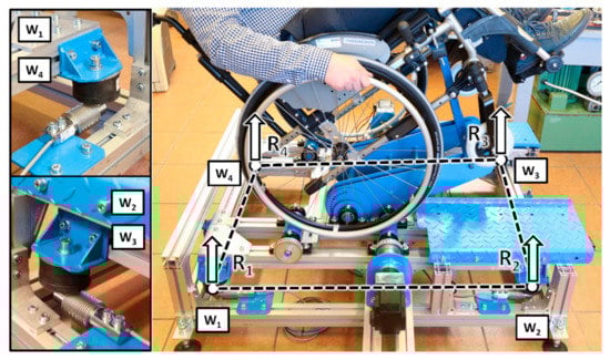 The measurement of the position of the human body center of gravity was conducted in the test stand, which was the chassis dynamometer for wheelchairs [] (P. 424482). The dynamometer was equipped with four strain gauge scales Wi (Figure 3), which enabled the measurement of reaction forces Ri which was the effect of loading the scale with the wheelchair, including a man.